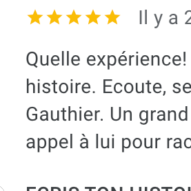 Quelle expérience! J'ai eu la chance d'être accompagnée par Gauthier pour écrire mon histoire. Ecoute, sensibilité, patience, tolérance, bienveillance... j'en passe sur les qualités de Gauthier. Un grand merci pour ces échanges et le temps consacré. N'hésitez pas à faire appel à lui pour raconter votre histoire.
